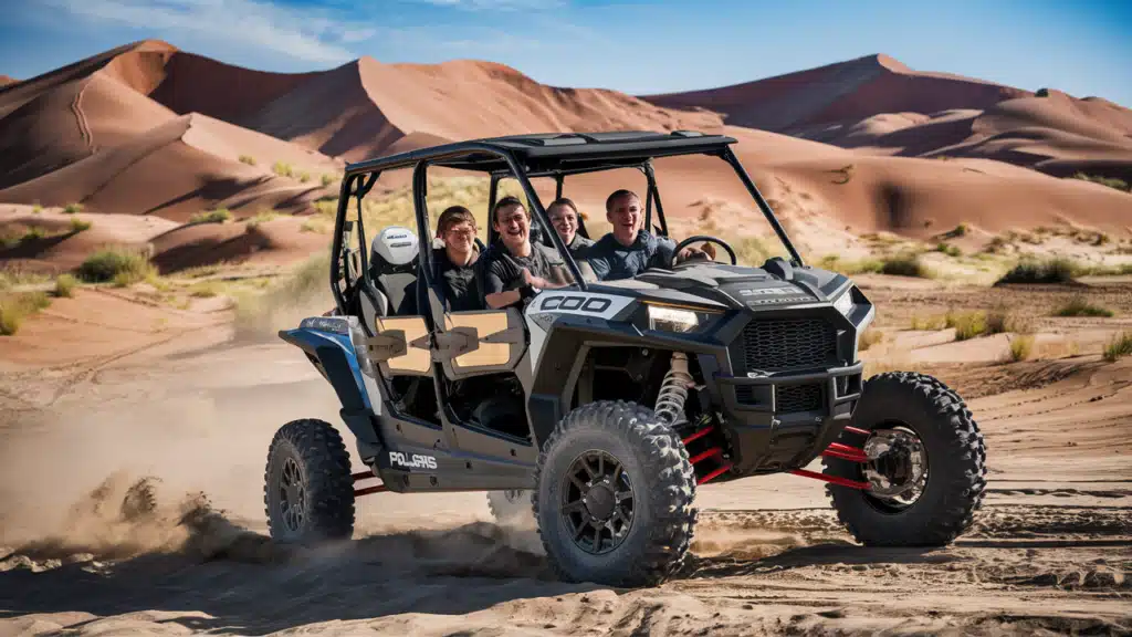 The Polaris RZR can reach high speeds, providing a thrilling and comfortable ride suitable for desert terrain.
